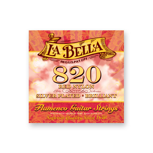 The 820 Flamenco sets contain red nylon trebles and silver-plated wound basses. Especially designed for the flamenco player, this set produces extremely brilliant tones with only the slightest left hand finger pressure.
